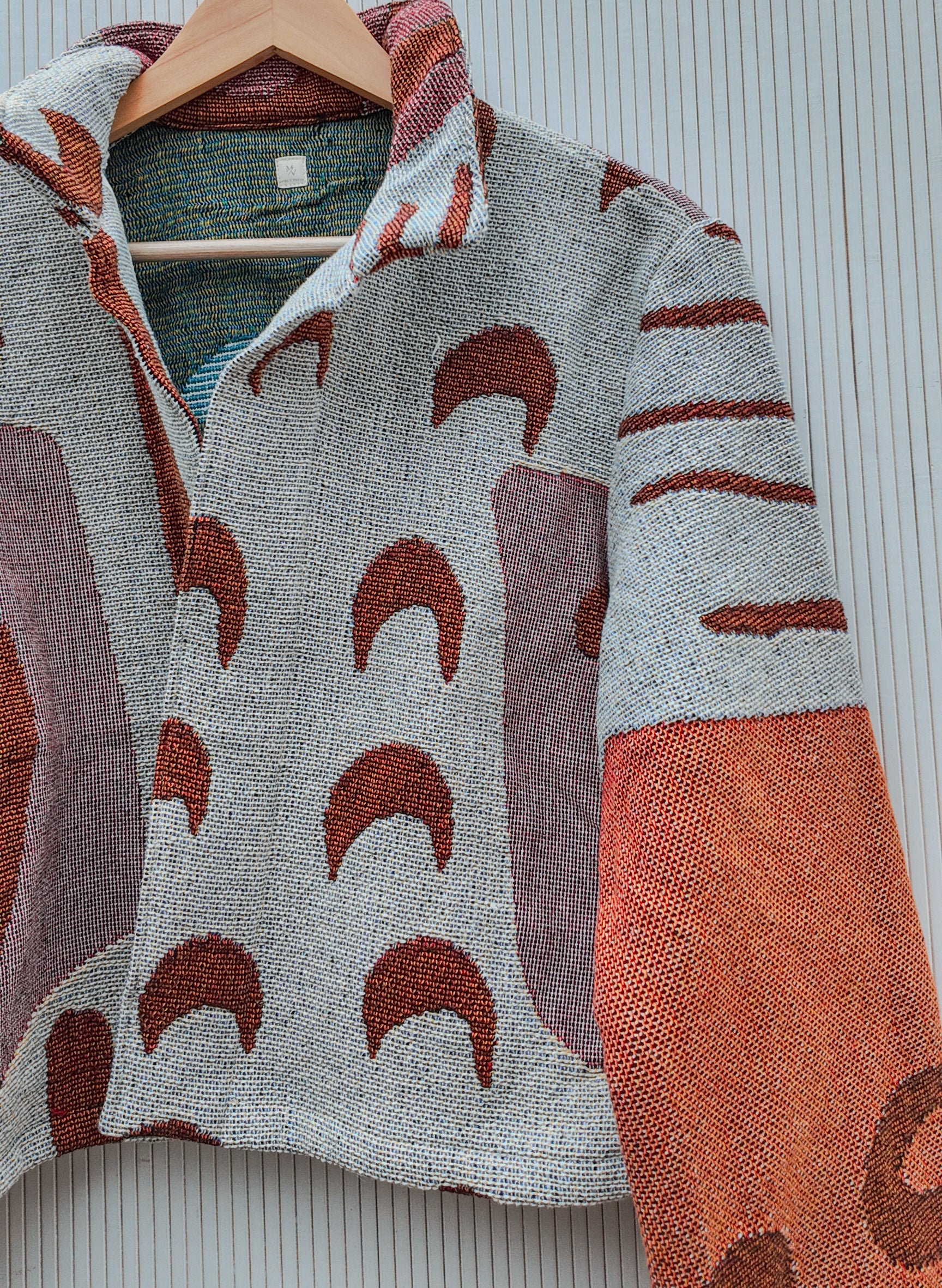 Made from a tapestry blanket, this one of a kind jacket features a cropped waist and coziness all around.