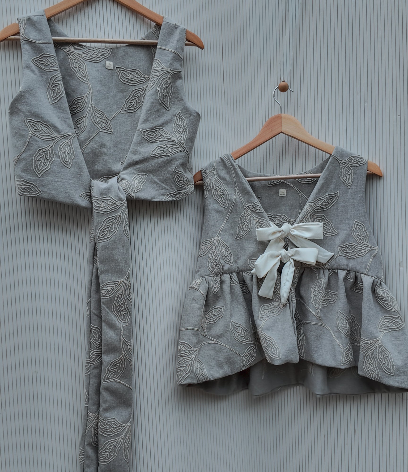Textile found at a huddle vintage store, this gorgeous embroidered linen gives a unique look at this design. Featuring two sating bows and long ruffles
